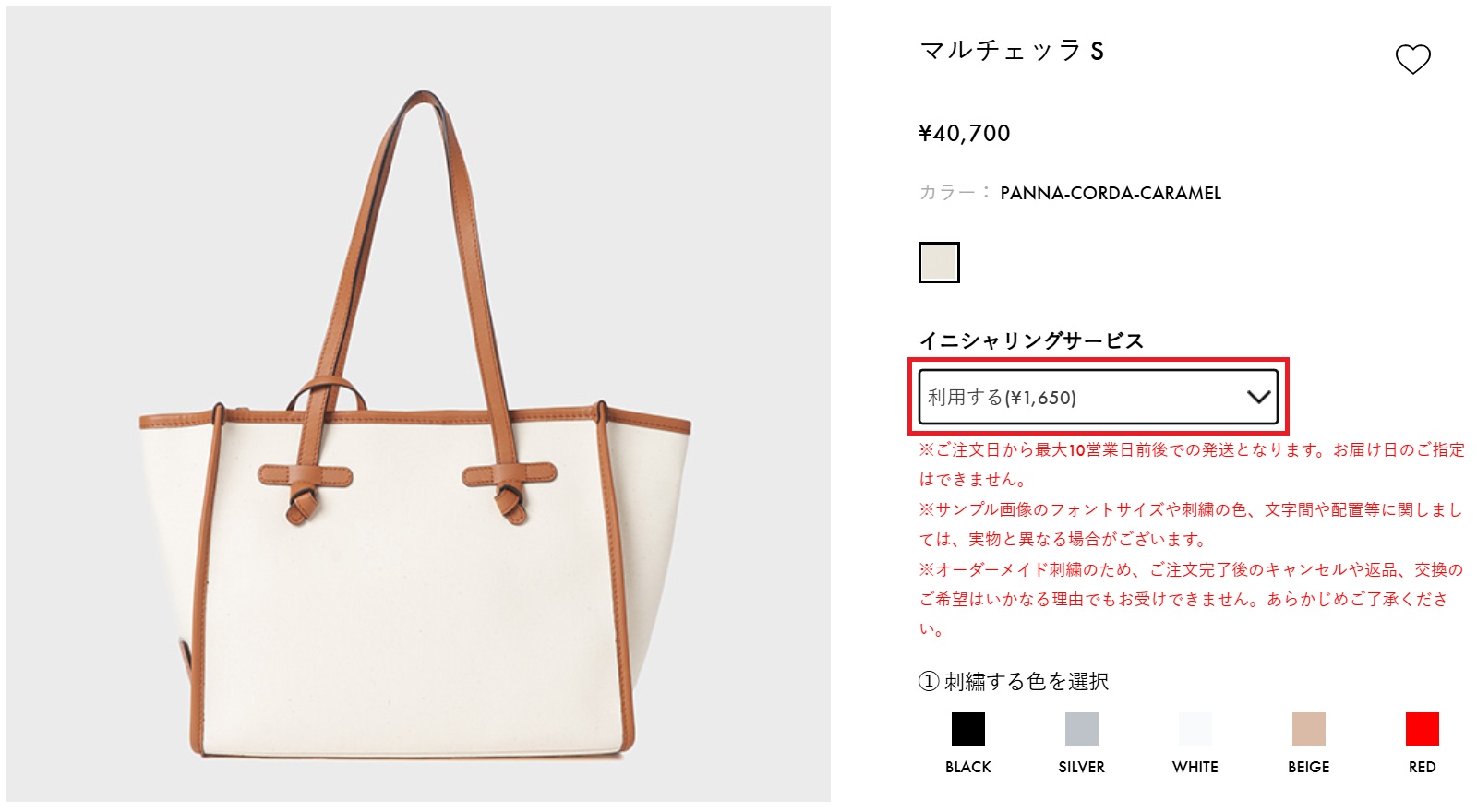 1. 刺繍可能な商品には、商品詳細ページに「イニシャリングサービス」の選択項目 がございますので、「利用する」を選択ください。