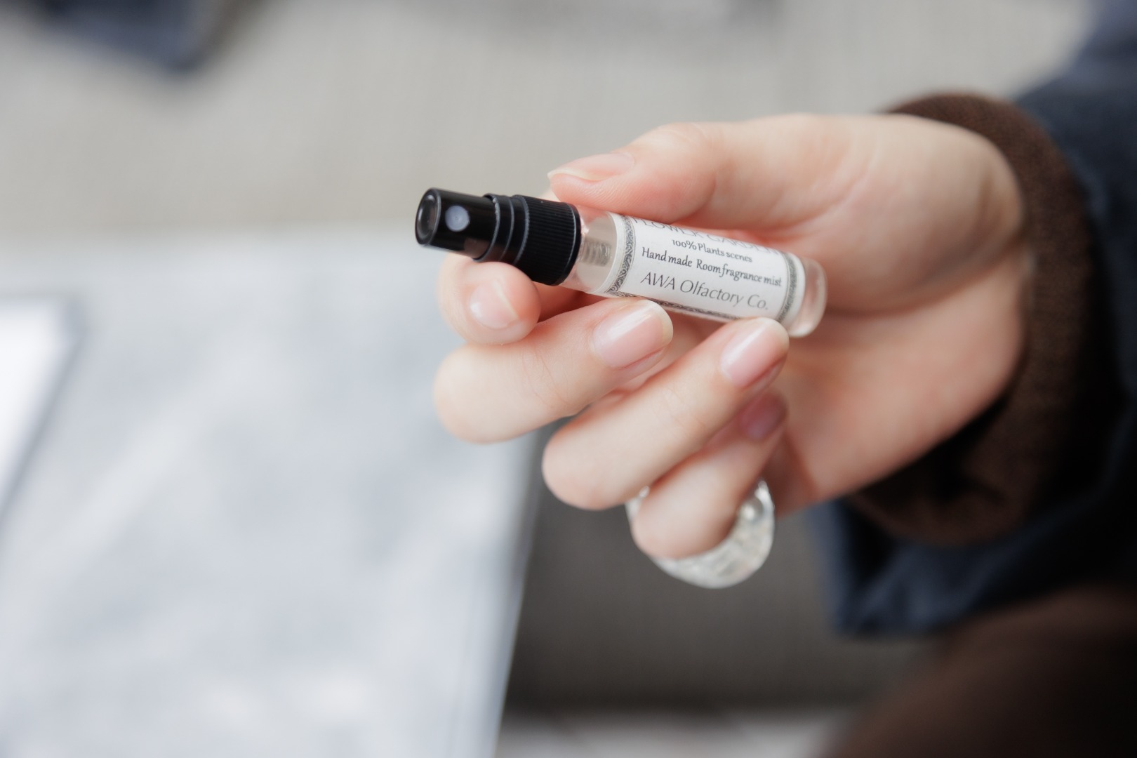 香水はdries van notenのものを、長丁場の撮影の時は気分転換ができる、AWAOlfactory Co.のルームフレグランスミストを使用してます。