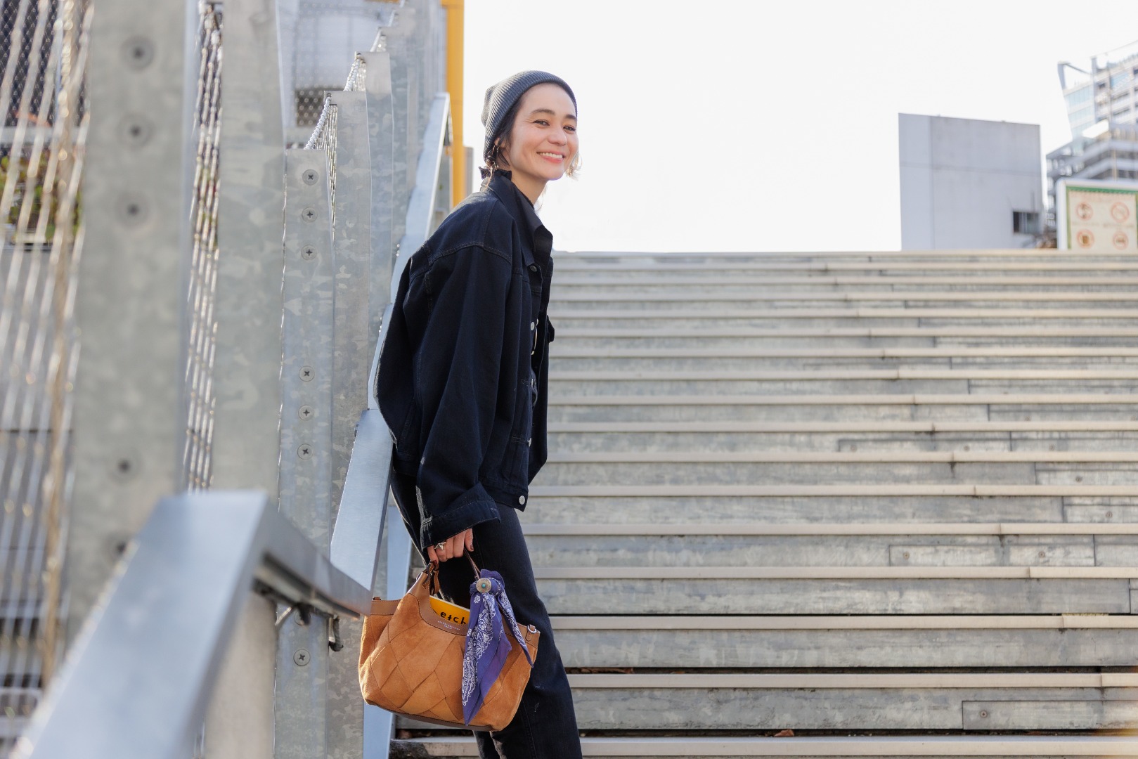 デザインのあるバッグなので、シンプルにまとめられるようにして使っています。